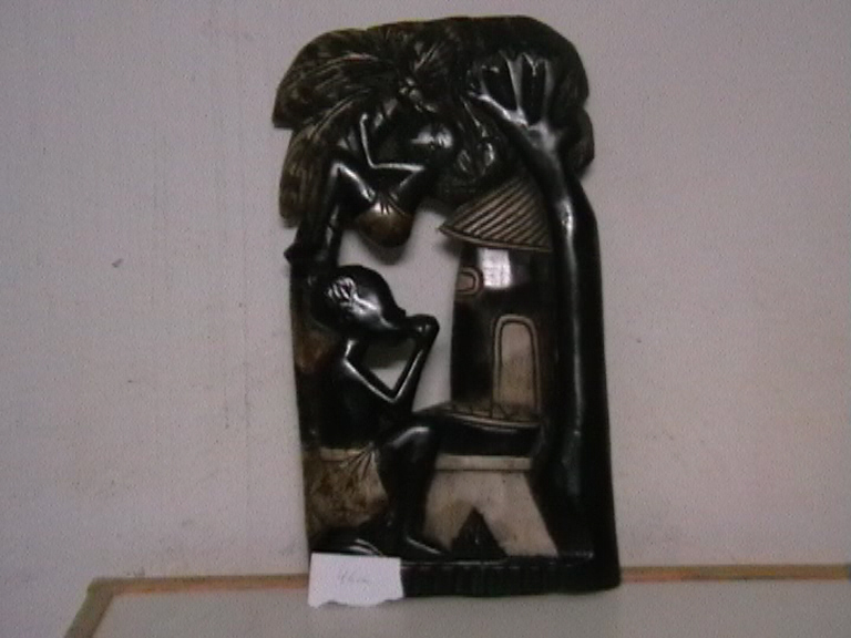 WBI 003 45X26cm, Holz, bemahlt. Frau unter Palmen mit Krug und Kind in den Palmen. 49,00€ (incl 19% MWSt, ohne Versand)